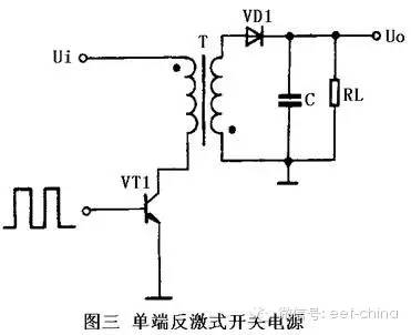 一、开关式稳压电源的基本工作原理 开关式稳压电源接控制方式分为调宽式和调频式两种,在实际的应用中,调宽式使用得较多,在目前开发和使用的开关电源集成电路中,绝大多数也为脉宽调制型。因此下面就主要介绍调宽式开关稳压电源。 调宽式开关稳压电源的基本原理可参见下图。 对于单极性矩形脉冲来说,其直流平均电压Uo取决于矩形脉冲的宽度,脉冲越宽,其直流平均电压值就越高。直流平均电压U。可由公式计算, 即Uo=Um×T1/T 式中Um为矩形脉冲最大电压值;T为矩形脉冲周期;T1为矩形脉冲宽度。 从上式可以看出,当Um 与T 不变时,直流平均电压Uo 将与脉冲宽度T1 成正比。这样,只要我们设法使脉冲宽度随稳压电源输出电压的增高而变窄,就可以达到稳定电压的目的。 二、开关式稳压电源的原理电路 1、基本电路 图二 开关电源基本电路框图 开关式稳压电源的基本电路框图如图二所示。 交流电压经整流电路及滤波电路整流滤波后,变成含有一定脉动成份的直流电压,该电压进人高频变换器被转换成所需电压值的方波,最后再将这个方波电压经整流滤波变为所需要的直流电压。 控制电路为一脉冲宽度调制器,它主要由取样器、比较器、振荡器、脉宽调制及基准电压等电路构成。这部分电路目前已集成化,制成了各种开关电源用集成电路。控制电路用来调整高频开关元件的开关时间比例,以达到稳定输出电压的目的。 2、单端反激式开关电源 单端反激式开关电源的典型电路如图三所示。电路中所谓的单端是指高频变换器的磁芯仅工作在磁滞回线的一侧。所谓的反激,是指当开关管VT1 导通时,高频变压器T初级绕组的感应电压为上正下负,整流二极管VD1处于截止状态,在初级绕组中储存能量。当开关管VT1截止时,变压器T初级绕组中存储的能量,通过次级绕组及VD1 整流和电容C滤波后向负载输出。 单端反激式开关电源是一种成本最低的电源电路,输出功率为20-100W,可以同时输出不同的电压,且有较好的电压调整率。唯一的缺点是输出的纹波电压较大,外特性差,适用于相对固定的负载。 单端反激式开关电源使用的开关管VT1 承受的最大反向电压是电路工作电压值的两倍,工作频率在20-200kHz之间。 3、单端正激式开关电源 单端正激式开关电源的典型电路如图四所示。这种电路在形式上与单端反激式电路相似,但工作情形不同。当开关管VT1导通时,VD2也 导通,这时电网向负载传送能量,滤波电感L储存能量;当开关管VT1截止时,电感L通过续流二极管VD3 继续向负载释放能量。 在电路中还设有钳位线圈与二极管VD2,它可以将开关管VT1的最高电压限制在两倍电源电压之间。为满足磁芯复位条件,即磁通建立和 复位时间应相等,所以电路中脉冲的占空比不能大于50%。由于这种电路在开关管VT1导通时,通过变压器向负载传送能量,所以输出功率范围大,可输出50-200 W的功率。电路使用的变压器结构复杂,体积也较大,正因为这个原因,这种电路的实际应用较少。 4、自激式开关稳压电源 自激式开关稳压电源的典型电路如图五所示。这是一种利用间歇振荡电路组成的开关电源,也是目前广泛使用的基本电源之一。 当接入电源后在R1给开关管VT1提供启动电流,使VT1开始导通,其集电极电流Ic在L1中线性增长,在L2 中感应出使VT1 基极为正,发射极为负的正反馈电压,使VT1 很快饱和。与此同时,感应电压给C1充电,随着C1充电电压的增高,VT1基极电位逐渐变低,致使VT1退出饱和区,Ic 开始减小,在L2 中感应出使VT1 基极为负、发射极为正的电压,使VT1 迅速截止,这时二极管VD1导通,高频变压器T初级绕组中的储能释放给负载。在VT1截止时,L2中没有感应电压,直流供电输人电压又经R1给C1反向充电,逐渐提高VT1基极电位,使其重新导通,再次翻转达到饱和状态,电路就这样重复振荡下去。这里就像单端反激式开关电源那样,由变压器T的次级绕组向负载输出所需要的电压。 自激式开关电源中的开关管起着开关及振荡的双重作从,也省去了控制电路。电路中由于负载位于变压器的次级且工作在反激状态,具有输人和输出相互隔离的优点。这种电路不仅适用于大功率电源,亦适用于小功率电源。 5、推挽式开关电源 推挽式开关电源的典型电路如图六所示。它属于双端式变换电路,高频变压器的磁芯工作在磁滞回线的两侧。电路使用两个开关管VT1和VT2,两个开关管在外激励方波信号的控制下交替的导通与截止,在变压器T次级统组得到方波电压,经整流滤波变为所需要的直流电压。 这种电路的优点是两个开关管容易驱动,主要缺点是开关管的耐压要达到两倍电路峰值电压。电路的输出功率较大,一般在100-500 W范围内。 6、降压式开关电源 降压式开关电源的典型电路如图七所示。当开关管VT1 导通时,二极管VD1 截止,输人的整流电压经VT1和L向C充电,这一电流使电感L中的储能增加。当开关管VT1截止时,电感L感应出左负右正的电压,经负载RL和续流二极管VD1释放电感L中存储的能量,维持输出直流电压不变。电路输出直流电压的高低由加在VT1基极上的脉冲宽度确定。 这种电路使用元件少,它同下面介绍的另外两种电路一样,只需要利用电感、电容和二极管即可实现。 7、升压式开关电源 升压式开关电源的稳压电路如图八所示。当开关管 VT1 导通时,电感L储存能量。当开关管VT1 截止时,电感L感应出左负右正的电压,该电压